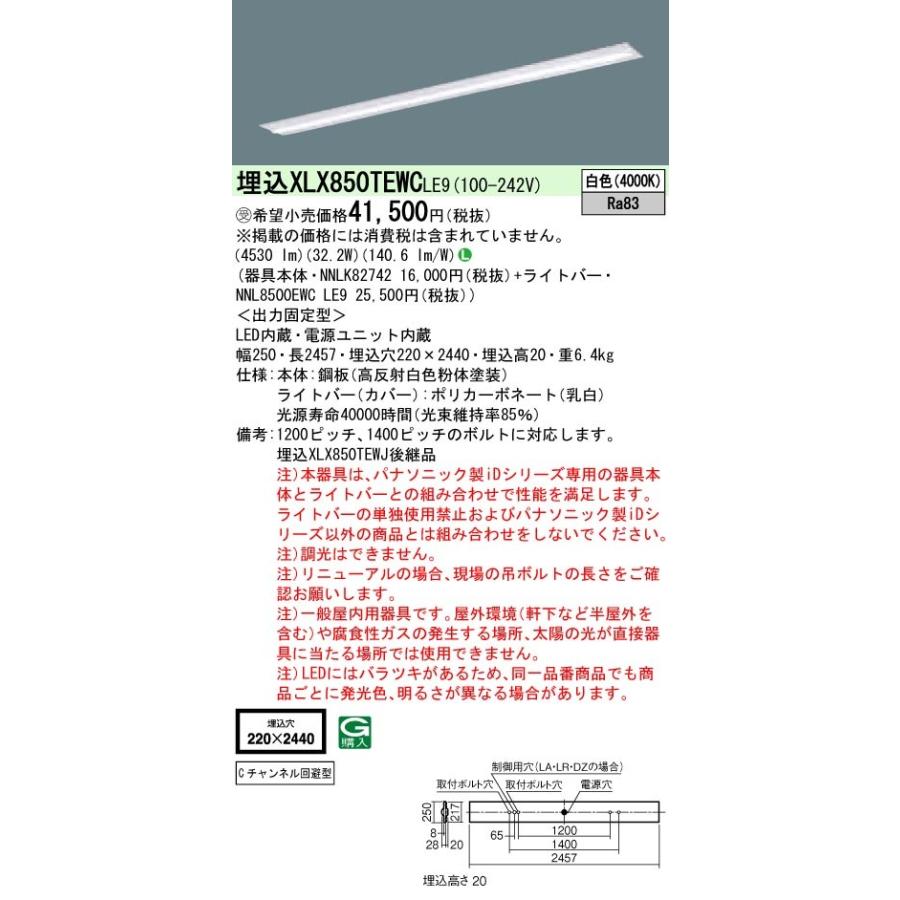 【法人様限定】パナソニック IDシリーズ XLX850TEWCLE9 埋込 下面開放型 W220 Cチャンネル回避型 110形1灯相当 5000 lm 非調光 白色【受注生産品】