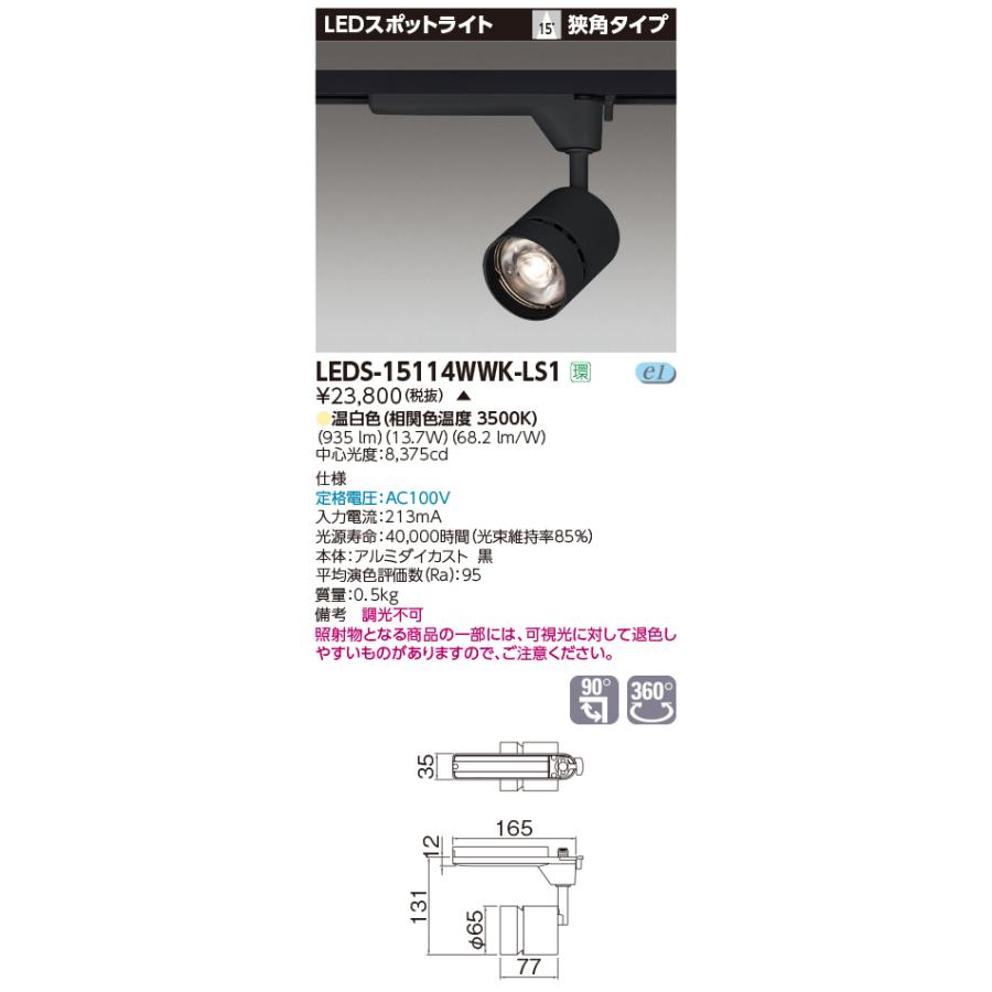 【法人様限定】【受注品】東芝 LEDS-15114WWK-LS1 LEDスポットライト LED一体形 狭角 本体:黒 温白色 1500シリーズ 演色性重視タイプ