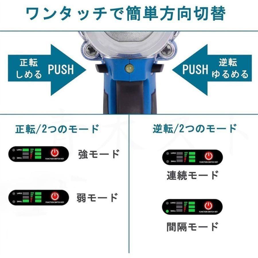 超強力電動レンチ電動インパクトレンチは最大トルク強モド中モド弱モド回転切り替えスイッチワンプッシュの簡単操作で正逆回転の切り替えができます誤作動防止の安全ロック機能付きボタンを真ん中にすると安全ロック状態となりこの状態で速度調整ボタンを使用することができません状態がわかるコントロルパネル簡単な操作で手軽に機能の設定が行えます逆転オトストップ逆回転時逆回転緩める時状態で機能スイッチを押すとランプがついた状態では約秒後に自動停止しますトルクパワ調節正回転時正回転締める時状態で機能スイッチを押すと段階でトルクパワの調整をすることができますバッテリ残量表示インパクトレンチを動かした際に一定時間バッテリ残量が表示されます機能スイッチ各種機能の切り替えを行えます大容量バッテリ付き大容量で取得の
