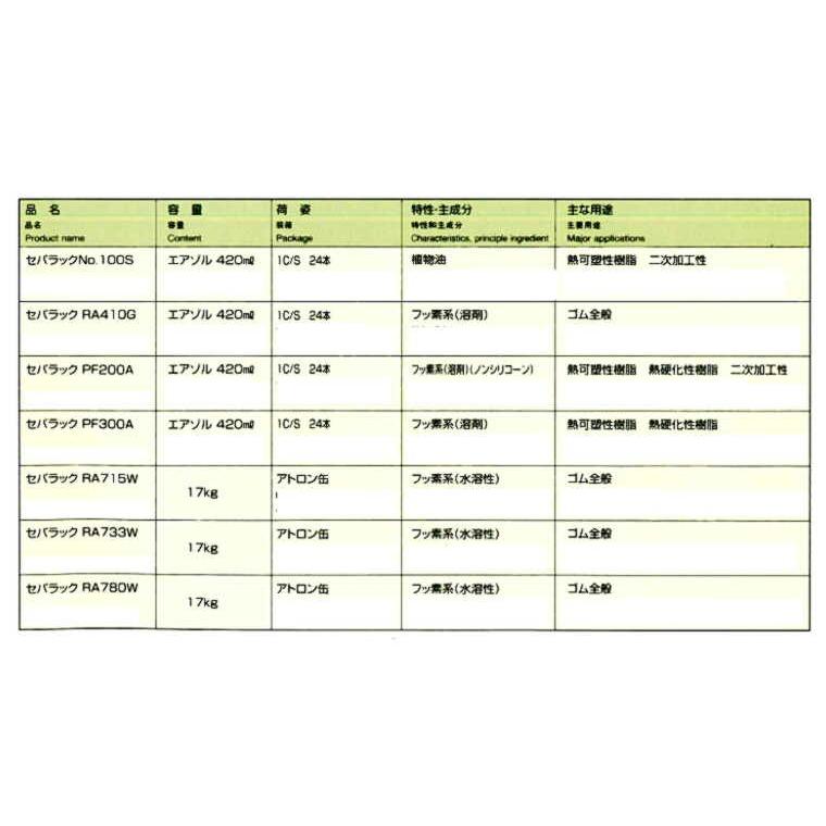セラパック 熱可塑性樹脂熱硬化性樹脂ゴム全般の離型 山一化学 指令対応 対応フッ素離型剤離型剤熱可塑性樹脂熱硬化性樹脂ゴム用全般品名容量荷姿特性主成分主な用途セバラック エアゾル 本 植物油 熱可塑性樹脂 二次加工性 セバラック エアゾル 本 フッ素系 溶剤ノンシリコン 熱可塑性樹脂熱硬化性樹脂 二次加工性 セバラック エアゾル 本 フッ素系 溶剤 熱可塑性樹脂熱硬化性樹脂 セバラック アトロン缶 フッ素系 水溶性 ゴム全般 セバラック アトロン缶 フッ素系 水溶性 ゴム全般 熱硬化性樹脂