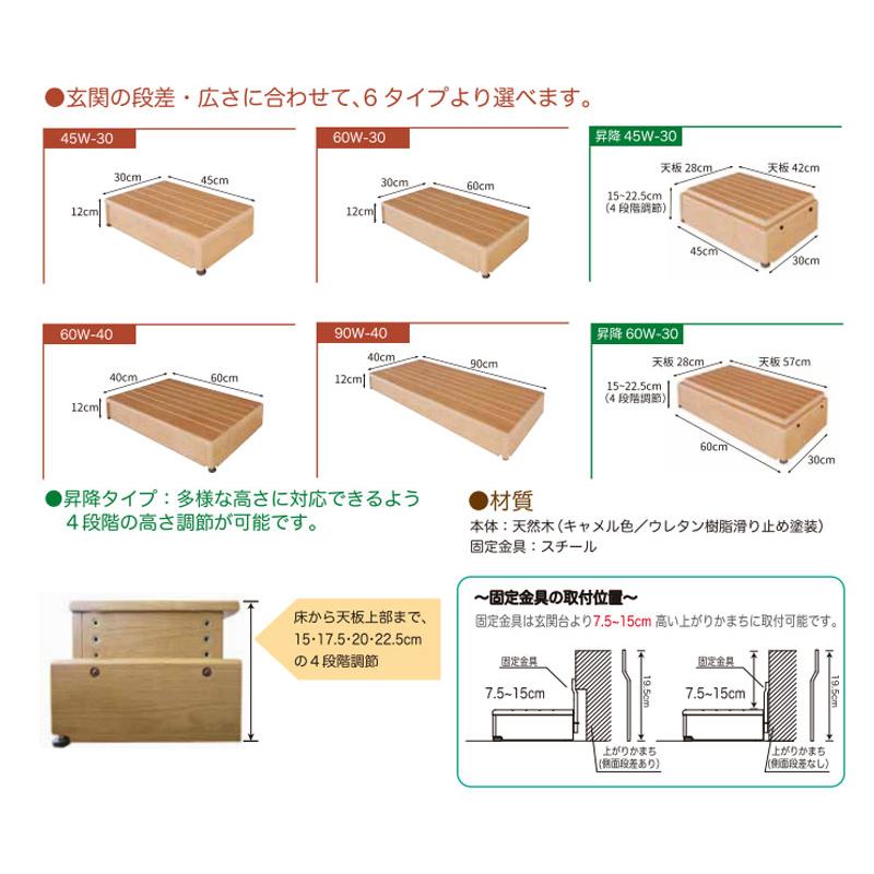 サイズ幅奥行高さ重さ約材質本体天然木ウレタン樹脂滑り止め塗装他生産国ベトナムメカ品番コドメカシコク玄関の段差広さに合わせてタイプより選べます天板に特殊塗料による滑り止め加工を施し滑りにくくなっています凹凸のある地面に対してもアジャスタで約調整できますので安定して取り付けできます固定具を使って玄関台を上がりかまちにしっかり固定できますサイズ幅奥行高さ重さ約材質本体天然木ウレタン樹脂滑り止め塗装他生産国ベトナムメカ品番コドメカシコク
