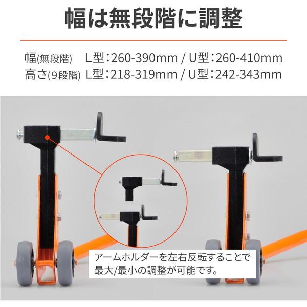 商品特長スペック チェン調整リアタイヤを取り外す作業などリア周りのメンテナンスには欠かせないリアスタンドです 新形状フレムと鋳造アムの採用により安心の剛性感 リフトアップ時にはロラが浮いてフレムが接地する構造にすることで作業時の安定感が向上 型と型アタッチメントを標準装備しアタッチメント幅は無段階高さは段階の調節が可能です 車両に合わせて適切な高さでリフトアップできます 幅無段階 型 型 高さ段階 型 型 スイングアムとスプルに対応したバイク用リアスタンド 対応スプル径 耐荷重 左右で段違い等のスイングアムには使用できません型アタッチメントを使用する際は別途スイングアムスプルを購入する必要があります