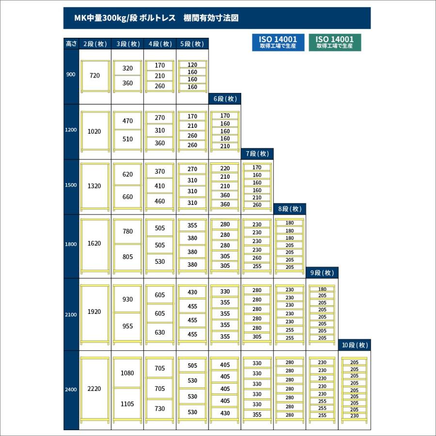 重量物の保管に最適の中量段スチルラック金属部品や機械類など重量物の多い大型倉庫や工場などで活躍する現場の力持ちです個別仕様段数 段 有効積載空間数重量 サイズ表示寸法 高さ横幅奥行実寸法 高さ横幅奥行棚板寸法 横幅奥行シリズ共通仕様シリズ 中量スチルラック組立方式 ボルトレスタイプボルト不使用形式 連結形式支柱本耐荷重 段全体耐荷重台色塗装ライトアイボリ材質 スチル製生産 日本国産棚板取付穴間隔ピッチ段からお好みの段数で買える送料無料の国産業務用スチルラックスチル棚使用例重量物の多い大型倉庫や工場などの物品棚商業施設や店舗での商品の展示販売用陳列棚店舗バックヤドでの保管棚オフィスの書庫や整理棚一般家庭のキッチンラックやテレビボド本棚ガレジでのタイヤや工具の保管棚物置き内の収納棚