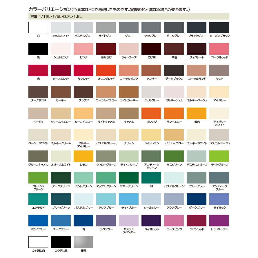 コチラはき商品ですよろしくお願いいたします配達時間の指定は出来ません揮発性有機溶剤トルエンキシレンなどをまったく含まない水性塗料ですシリコン樹脂と異層構造樹脂配合で汚れにくく耐久性にも優れています用途門扉フェンス物置ロッカ鉄柵手すりなどの屋内外鉄部鉄製品外板板塀羽目板雨戸戸袋ガデニング用品などの屋内外木部木製品ブロックモルタルコンクリト壁各種サイディング窯業系無機コディングしたセラミックサイディングは除く浴室台所居間などのモルタルコンクリトなど特徴鉛クロムなどの有害な物質を使用していない塗料シリコン樹脂と異層構造樹脂配合で汚れにくく耐久性にも優れた高性能塗料酸性雨や酸性雪排気ガス塩害に強い塗料エナメル調の美しいつや有りに仕上がります別売りのツヤ消し剤ツヤ調整剤を使ってマイルドなツヤに調整ができますつや消し色は除く厚塗りしてもタレにくく刷毛さばき性に優れた塗料日本塗料工業会塗料用標準色の色に対応しプロでも選びやすい色設定一部の色を除く数量ケス個入りカラシックグレ容量塗り面積回塗り約タタミの広さで約枚分うすめ液水道水用具洗いも同じ乾燥時間指触約分半硬化約時間冬期指触約時間半硬化約時間