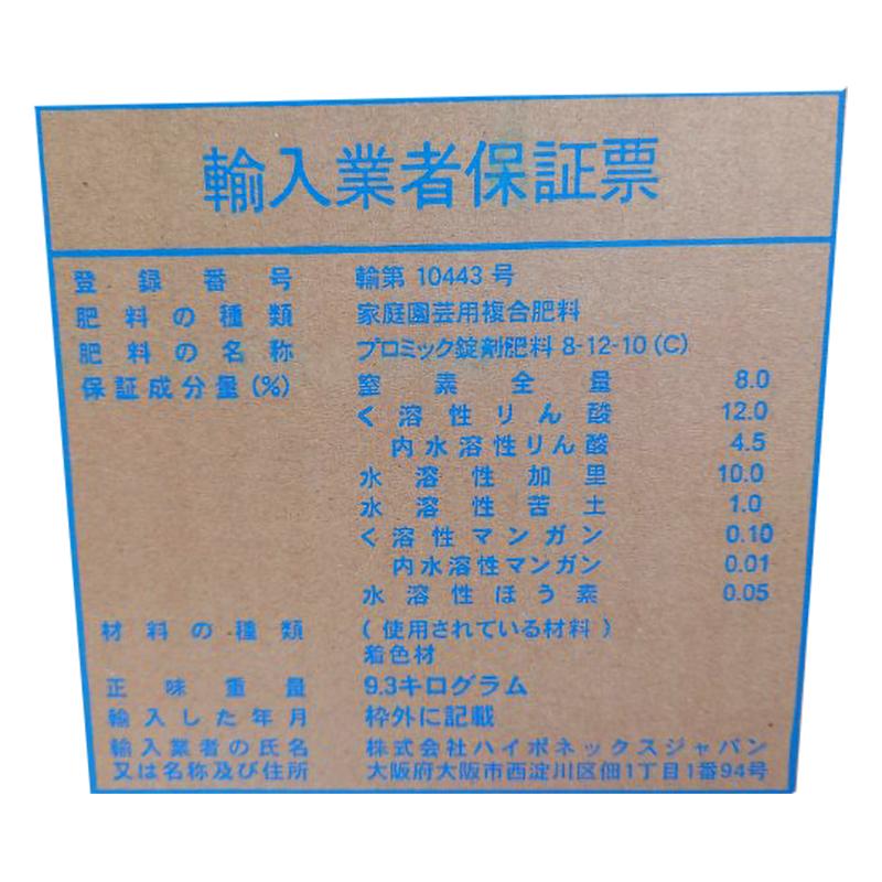 中粒 プロミック錠剤 スタンダド 登録番号輸入第号種類家庭園芸用複合肥料有効成分性状粒状肥料効果ヵ月ヵ月半内容量特長栄養成長と開花のバランスを取りたい時におすすめです鉢物用錠剤置肥しっかり速く効くため生育の反応が分かりやすいの人気の高い肥料です鉢花花壇苗野菜苗ハブ花木類などの生産に幅広く使用できます錠の重さがほぼ均一のため鉢ごとの施用成分量が一定となり均一の鉢生産を促します施肥量を誤ることが少なく施肥管理が容易で施肥の省力化に適していますスタンダドタイプは溶出が異なる数種類の肥料成分からなり施肥初期から後期まで段階的に溶出し植物に吸収されます使用法鉢土の上に置き錠剤が崩れてきたら新しい錠剤にとりかえます適用植物鉢花花壇苗野菜苗観葉植物花木類