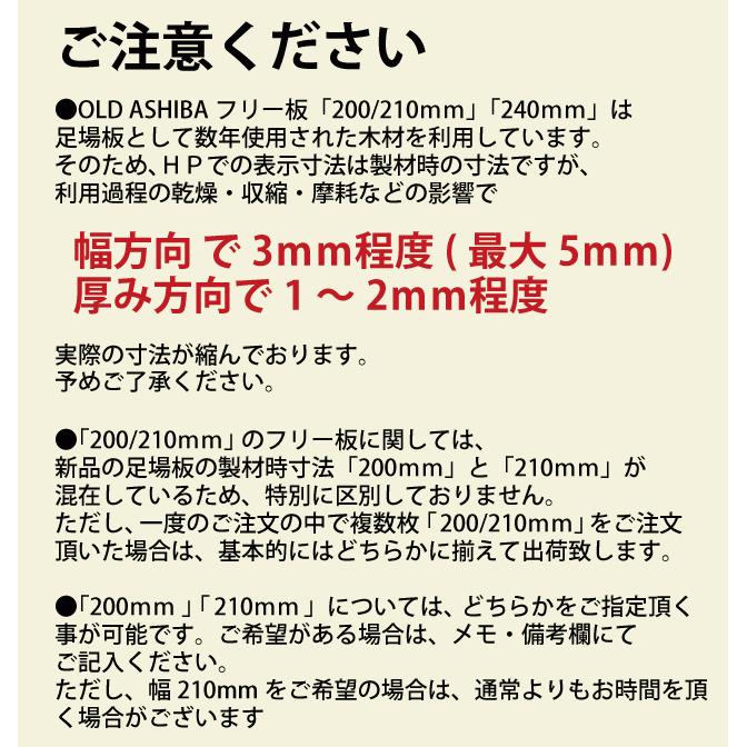 素材生産 足場板古材実際に建築現場で使用された無垢の杉足場板です本社広島県廿日市市の工場で選別水洗い天日乾燥研磨製作出荷を行っています厚み実寸は程度幅面古材板幅はどちらか指定可能幅をご希望の場合お時間を頂く可能性あり長さ注意事項幅は製材時の寸法です利用過程の乾燥収縮摩耗などの影響で収縮します幅程度幅程度幅のフリ板は新品の足場板の製材時に混在するため特別に区別しておりませんただし一度のご注文の中で複数枚の幅をご注文頂いた場合はどちらかに揃えて出荷いたします足場板古材は見た目にかなり個体差があります見た目のご要望については個人の感覚にかなり左右されるため原則お受けできません 足場板古材フリ板は実際に建築現場の仮設材として使われてきた無垢の木材杉足場板ですその過酷な使用環境の中で様々なダメジや時間の流れが刻み込まれています傷欠け錆び跡日焼け数々のダメジがそれぞれの個性を作りその表情が味わいになりますフリ板は枚からご購入可能で表面は古材の味わいを残しつつ滑らかにサンディングしてあるので届いたその日ににご利用可能角の面取りもしていあるので見た目も優しくお子様にも安心です一枚板から複数枚をつないだ幅つなぎ幅はぎ材まで厚みも幅も長さもサイズバリエションが豊富用途やご予算に合わせてお選び頂けますジブン好みの住まいにするのがきっと楽しくなる素材です 足場板古材商品ご購入の前に必ずお読みください素材色について詳しくはコチラをご確認下さい