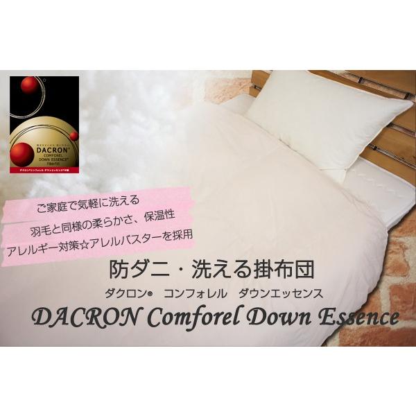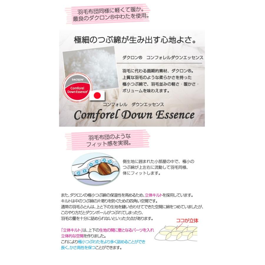 ダクロン コンフォレルダウンエッセンスは羽毛に近い快適性と保温性の洗える掛布団です特殊なつぶ綿の技術により真に羽毛に近い快適性と保温性が実現しました特殊コティングされた細デジテックスのつぶ状の綿が自在に動き羽毛に極めて近いフィット性快適性を提供しますまた側生地には防ダニ効果のあるアレルガド生地を採用しました丸洗い出来て清潔安心です商品詳細布団がわ ポリエステル 綿詰め物 ポリエステル 生産国 日本
