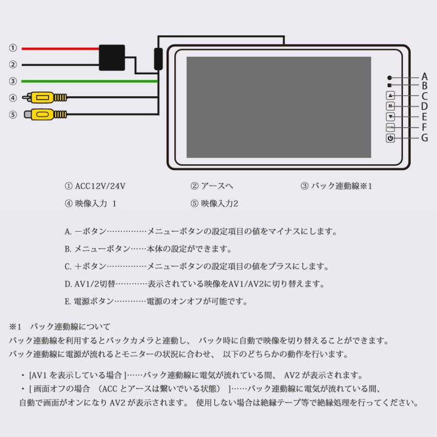 インチ バックミラモニタ表示比率変更可能 上下左右の反転表示対応バックカメラ連動機能系統映像入力セブ電源機能製品仕様モニタサイズインチ解像度動作電圧表示モド メニュ言語日本語英語中国語 他本体サイズ約 本体重量約 仕様および外観は改良のため予告なく変更されることがありますあらかじめご了承ください