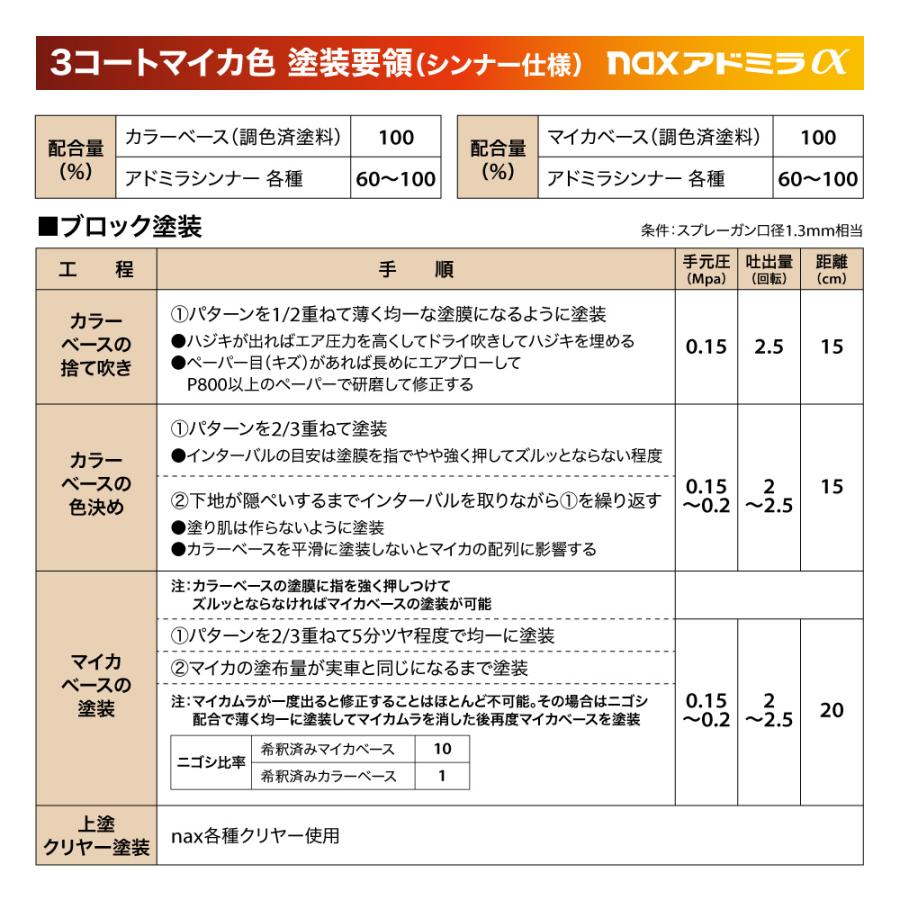 日本ペイント アドミラ 液ウレタン塗料を小分けで販売しております無地缶に詰め替えてのお届けとなります主な使用車種 エクリプスクロス希釈済の為そのまま塗装できます別途クリヤが必要となりますので合わせてお買い求め下さいアドミラ塗料は必ずクリヤで仕上げなければなりませんこの商品はスプレガン塗装用の商品です使用方法塗料を良く攪拌しストレナでろ過してから塗装します 仕上げに必ずクリヤを塗装しますクリヤは本品のセットには付属しませんキワド自動車用ウレタン塗料 液 日本ペイント ウレタン 塗料 アドミラ 自動車メカ純正色 日本ペイントアドミラ 車 塗料 アドミラアルファ 三菱 画像の撮影状況モニタ環境によりイメジを実際の色と違って見える場合がございます購入後に思っていた色と違う等のクレム返品等は一切お受けできませんのでご了承下さい 注文を受けてから日本ペイントの配合デタをデジタル計量機にて正確に調合しております日本ペイントの配合デタは単位の為厳密には同じになる事はあり得ません多少の色ズレを生じますご注文毎の受注生産の為後から同じ色を追加注文した場合多少の色ズレを生じますので発注の際は余裕を持った量でご注文ください また製造工程上容量毎の生産となります同じ色で同じ容量を複数ご注文の場合も同様に多少の色ズレを生じます事をご了承ください 例トヨタ入り個ご注文の場合入りを個ずつ個別に調色する為多少の色ズレが生じます 免責事項 デタ調色の為大小にかかわらず色の誤差などのクレムは一切お受けできません デタ調色は単位の為厳密には同じになる事はあり得ません多少の色ズレを生じますこれはデタ調色においては常識的且つ一般的な免責事項ですので予めご了承ください 補修塗装時で隣接パネルがある場合ボカシ塗装は当然必要となり場合により更なる微調整が必要ですこれはプロの鈑金塗装業でも常識的な作業ですので予めご了承下さい全塗装などは色ズレを比べる部分がないので微調整は不要です 以上をご理解頂けた方のみご注文くださいます様お願い申し上げます 関連商品はこちら 関連商品テキストのみの場合 アドミラアルファ自動車メカ純正色 レアル自動車メカ純正色 スペリオ自動車メカ純正色 自動車用塗料関連商品 洗浄用脱脂用溶剤関係 道具資材 関連商品テキストのみの場合