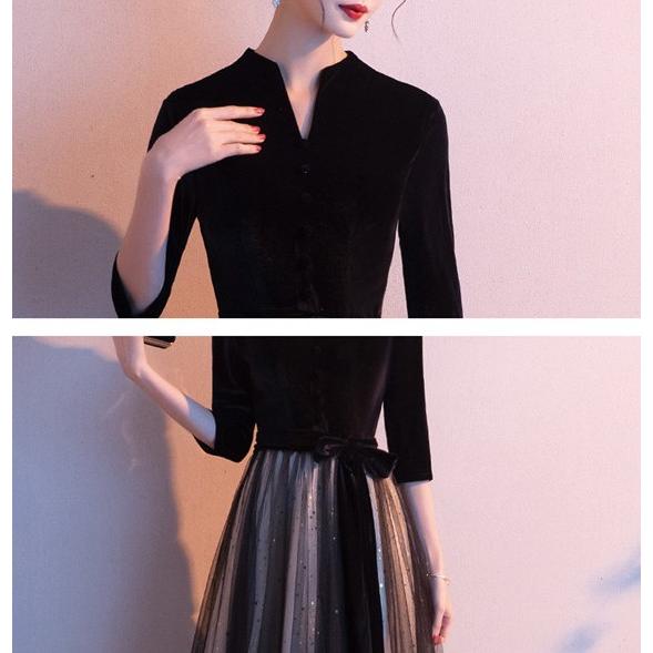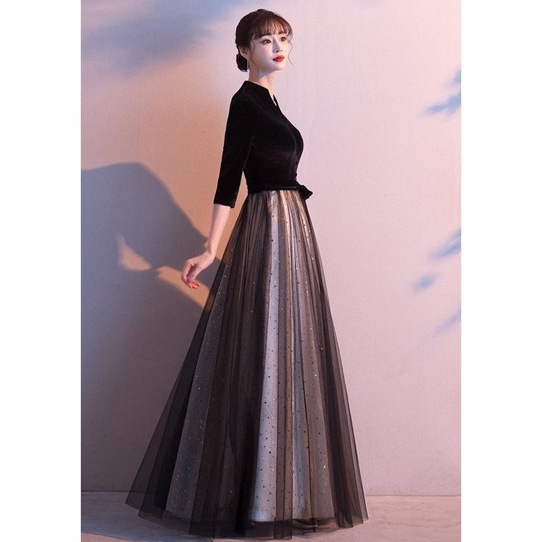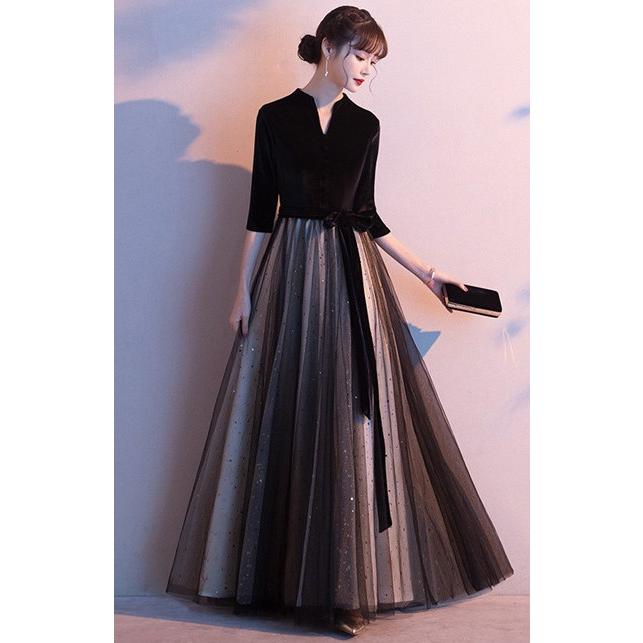 パーティー ドレス ロング 演奏会 ブラック 黒 大人 ピアノ 発表会 袖あり Vネック 演奏会 袖あり 20代 30代 大人 上品 発表会