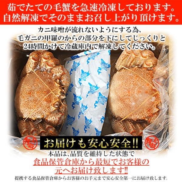 北海道の代表的な海の幸繊細で濃厚な味わい尾約尾至福の時味噌が美味旨味と風味がある毛ガニの定番は茹でた毛ガニをカニ酢でいただく食べ方ですが毛ガニの特徴の一つであるカニ味噌を身につけて食べたり甲羅酒もおすすめです茹でたての毛蟹を急速冷凍しております自然解凍でそのままお召し上がり頂けますカニ味噌が流れないようにする為毛ガニの甲羅のからの部分を下にしてじっくりと時間かけて冷蔵庫内で解凍してください本品は品質を維持した状態で食品保管倉庫から最短でお客様の元へお届け致します