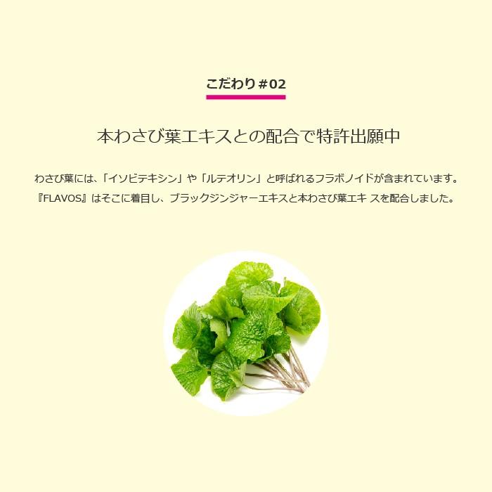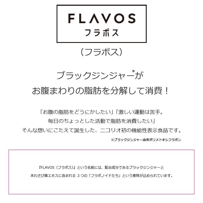 フラボスという名前には配合成分であるブラックジンジャと本わさび葉エキスに含まれる つのフラボノイドたちという意味が込められています 商品情報 製品仕様商品名フラボス名称ブラックジンジャ抽出物含有加工食品賞味期限枠外下部に記載内容量袋粒入り粒約ヵ月分栄養成分表示粒あたりエネルギたんぱく質脂質炭水化物食塩相当量保存方法直射日光高温多湿をさけて保存してください原材料商品内容ブラックジンジャ抽出物ブラックジンジャエキスデキストリン国内製造還元麦芽糖水飴本わさび葉エキスセルロスシクロデキストリンステアリン酸カルシウム二酸化ケイ素届出番号届出表示本品にはブラックジンジャ由来ポリメトキシフラボンが含まれますブラックジンジャ由来ポリメトキシフラボンは日常生活における身体活動時のエネルギ代謝において脂肪の消費を促す作用によりが高めの方の腹部の脂肪内臓脂肪および皮下脂肪を減らす機能が報告されていますまた年齢とともに低下する脚の筋力に作用することにより中高年の方の歩く力を維持することが報告されています商品説明お腹の脂肪をどうにかしたい軽めの運動で何とかしたい毎日のちょっとした活動で脂肪を消費したいそんな方にオススメしたい機能性表示食品です広告文責株式会社ニコリオ注意用法日粒を目安に水又はぬるま湯などと一緒にお召し上がりください生産国商品区分日本製機能性表示食品販売業者名株式会社ニコリオ東京都世田谷区太子堂キャロットタワ製造所固有記号は賞味期限表示右に記載 商品情報