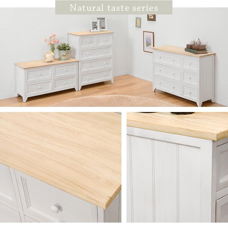 フレンチカントリスタイルのデザインが素敵な天然木桐材で作られたかわいいチェスト高さ低めでディスプレイ棚として使い勝手の良い高さ木製のシャビシックな白とアンティク調のナチュラル天板の組み合わせがおしゃれです高級天然木の桐を使った軽くて高品質な木製素材で衣類の収納などにも最適なこだわりの素材です引き出しは杯で洋服タオル書類などをたっぷり収納できますリビングや寝室デスクサイドの収納家具として最適クラシックスタイルがお好きな方にもおすすめですカラホワイトサイズ約幅奥行高さ引出内寸約幅奥行深さ本体素材桐材重量約完成品関連ワド木製 天然木 洋服 下着 ハンカチ タオル 文房具 小物 キッチン リビング 寝室 クロゼット 収納 チェスト 箪笥 タンス たんす ラック クラシック 姫系 ロココ調 白家具 フレンチカントリ アンティク加工 ヨロピアン シャビシック 北欧 かわいい 可愛い おしゃれ オシャレ 一人暮らし 新生活 女性 子供部屋 店舗 セル 商品詳細 カラ ホワイト サイズ サイズ約幅奥行高さ引出内寸約幅奥行深さ重量約 素材 桐材 注意事項 アンティク加工 備考 完成品