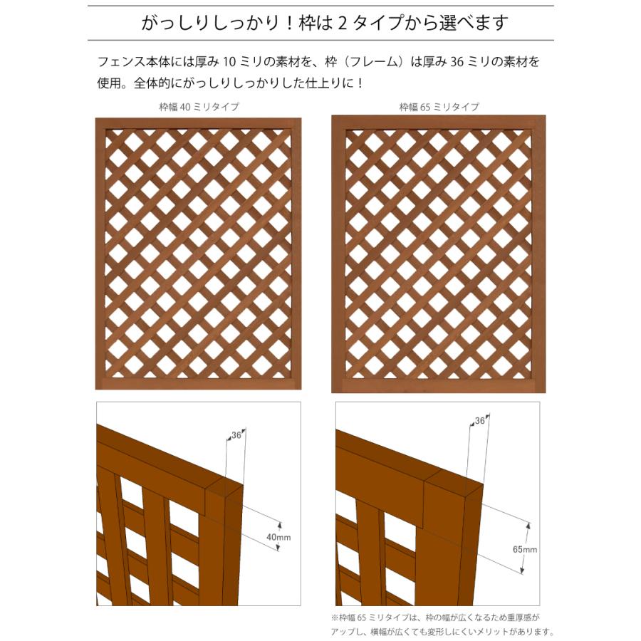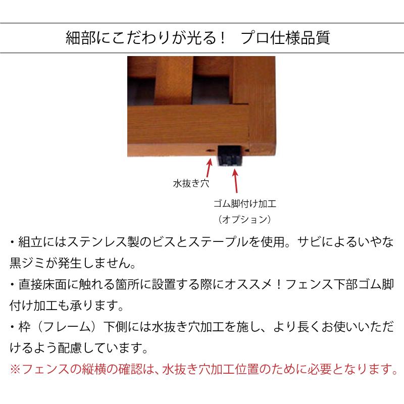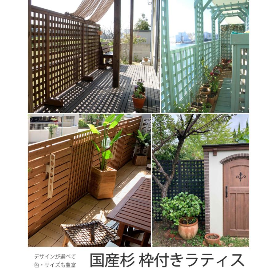 商品説明充実したサイズバリエションでジャストフィット使用条件に合わせた最適サイズの選択が可能です下フレム枠に水抜き加工を施すため使い勝手を特定する必要がありますフェンスの長辺を縦方向に使う場合縦使い 横に使う場合横使いですデザイン格子枠幅組立不要完成品でお届けします素材生産国産杉本社広島県廿日市市の自社工場で一つ一つ手作りで生産 エクステリア 庭用フェンス 枠付きラティス格子