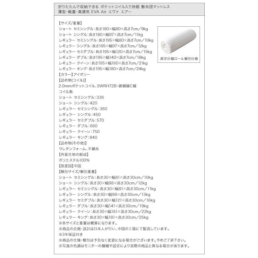 ベッドに敷布団に合う薄型軽量デザイン 折りたたんで収納できる ポケットコイル入り 快眠 敷布団マットレス 薄型軽量高通気 エヴァ エア シングル ショト丈 アイボリサイズ重量ショト シングル長さ幅高さ詰め物コイルポケットコイル硬鋼線種コイル数ショト シングル詰め物その他ウレタンフォム不織布外装生地の組成ポリエステル原産国中国梱包サイズ梱包重量ショト シングル長さ幅高さ各サイズと重量は概算になります商品の企画設計は日本人が行い中国の工場にて製造しています年保証付き商品の仕様梱包は予告なく変更になる場合がございます予めご了承下さい写真の色調はモニタの機種や設定により実際の商品と異なる場合があります発送について 納 期メカ倉庫直送入金確認後営業日内発送北海道沖縄県へは送料がかかりますただし離島は配送です予めご了承ください商品は玄関渡しになります 土 日祝はお休みさせていただきます初期不良の場合はお届け後週間以内に限り返品交換対応可能です到着後破損不良等の有無をお確かめ下さい配送時の梱包のまま交換お願いします梱包材が無い場合でのお引取りはできませんのでご注意下さい お客様都合によるイメジ違いサイズ間違い等の事由では交換返品キャンセル等お受けできません 在庫状況は日々変動しておりお支払いのタイミングによってはメカ在庫が欠品となる場合がございます生産状況や同時注文等により欠品となる場合もございます在庫切れの場合はキャンセルとしてお受けいたします 最新の在庫状況のご確認は質問欄よりお問い合せくださいませ