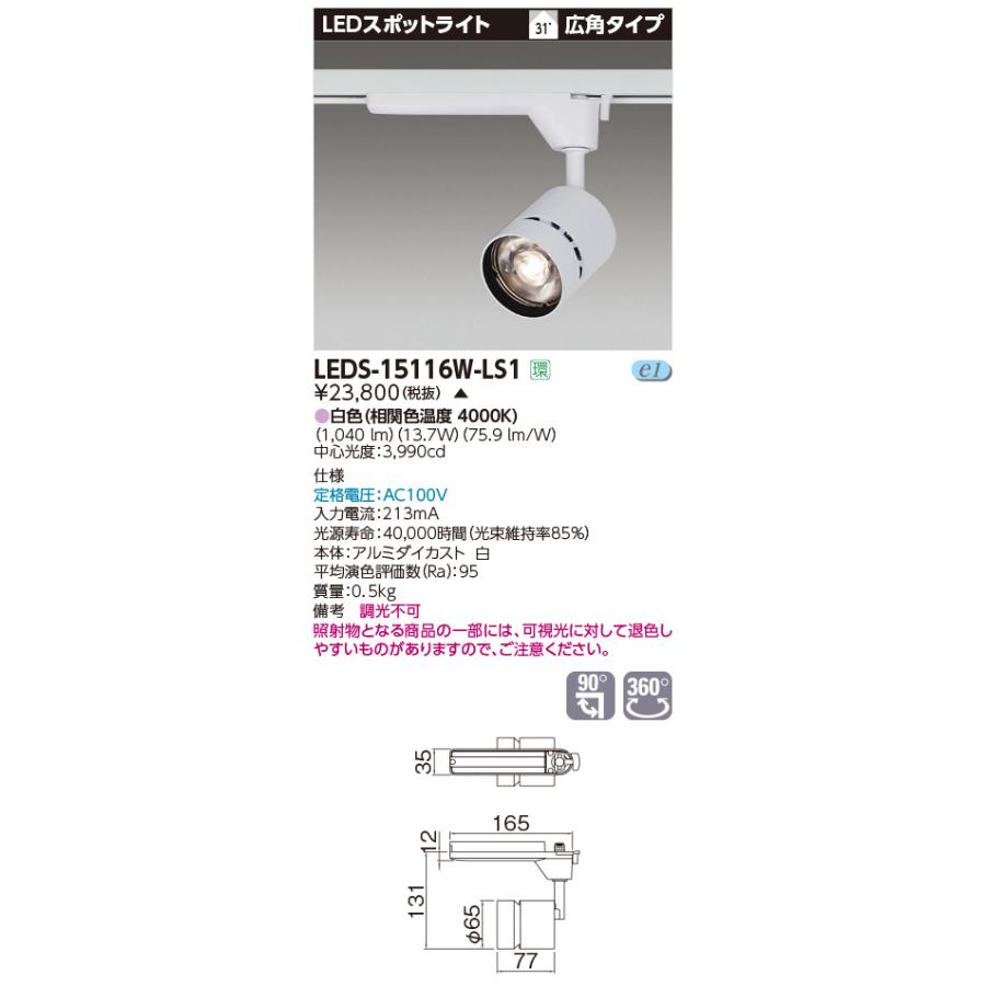 【法人様限定】東芝 LEDS-15116W-LS1 LEDスポットライト LED一体形 広角 本体:白 白色 1500シリーズ 演色性重視タイプ【受注品】