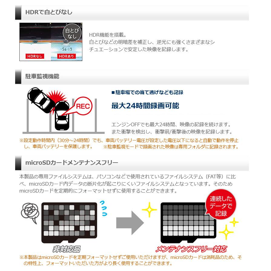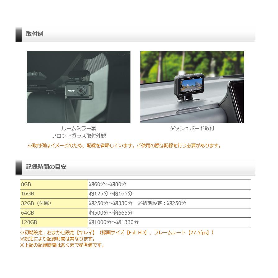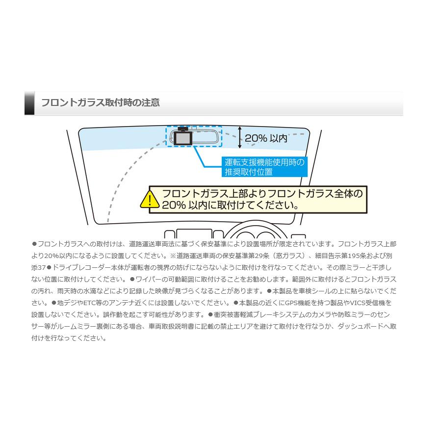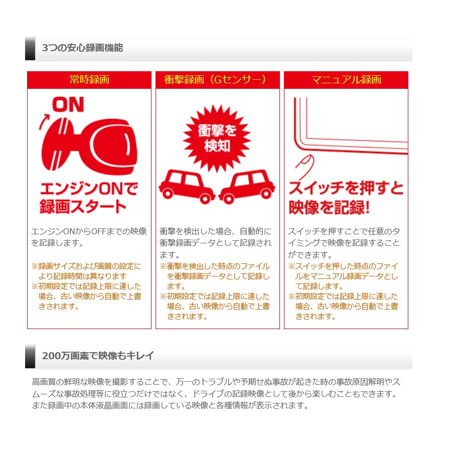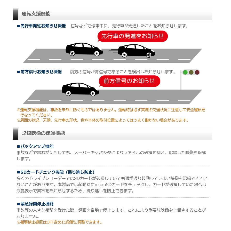 インチ大画面液晶搭載先行車発進前方信号お知らせ機能など運転支援機能搭載電源をオディオ裏などから隠して接続可能な配線コドセット 説明 見出し 製品情報 見出し 説明文 電源電圧 最大消費電流通常時以下スパキャパシタ充電時以下 動作温度範囲 液晶サイズインチフルカラ液晶 カメラ 撮像素子型センサ 総画素数万画素 有効画素数最大万画素 レンズ画角水平垂直対角 値 本体サイズ突起物除く取付ステ装着時 重量 付属品シガプラグコド約取付ステ固定用両面テプ脱脂クリナカド セット内容ドライブレコダドライブレコダ用電源直接配線コド約本製品にはお買い上げの日から年間の製品保証がついていますただしカド両面テプ本体内蔵バッテリ等の消耗部品およびその他付属品は保証の対象となりませんダッシュボド上へ取り付ける場合は道路運送車両法に基づく保安基準に適合させるため運転や視界の妨げにならない場所に取付けてください道路運送車両の保安基準第条運転者席細目告示第条および別添本製品は車室内専用です式信号機はが高速で点滅している為信号機が点滅しているような映像が記録される場合がありますまた逆光や信号機自体の輝度が低い等信号機の色が識別できない場合がありますそのような場合は信号機通過前通過後の映像や周辺の車両状況などから判断してください信号の識別記録に関する内容については一切の責任を負いかねますのでご了承ください本製品使用時は必ず付属のカドを使用してください付属品以外のカドとの相性による動作不良については一切の責任を負いかねます本製品は全ての映像を記録することを保証するものではありませんあらかじめご了承ください本製品は使用方法によりプライバシなどの権利を侵害するおそれがありますのでご注意くださいまたイタズラなどの目的で使用しないでくださいこれらの場合について一切の責任を負いかねます本製品は車専用です運転支援機能について運転支援機能は運転者の負担軽減を目的とし周辺状況走行状態の変化を補助的にお知らせする機能です全ての周辺状況走行状態を判断する事はできませんまた事故を未然に防ぐ機能ではありません一部機能はを受信していない状態では動作しません運転支援機能を使用する場合ボンネットを録画映像の下部から以内に収める必要があるためフロントガラス上部中央への取付けを推奨します本体の取付位置角度フロントガラスの汚れなどにより正しく動作しない場合があります画像情報を基に動作するため先行車や車線信号機以外の周辺物や景色の変化などでもお知らせを行う場合があります各機能動作時の表示画面は録画ファイルには記録されません画像はイメジです実際の商品とは異なる場合がございますパッケジにつきましてはメカの仕様変更等により予告なく変更になる場合がございますパッケジの違いによる返品交換は承っておりませんので予めご了承ください 説明文 説明