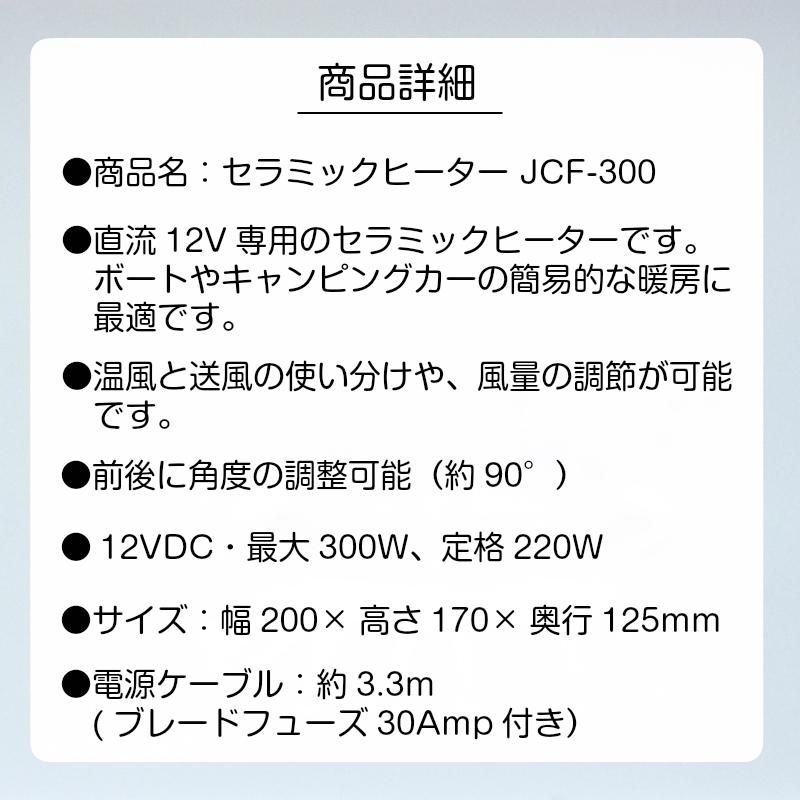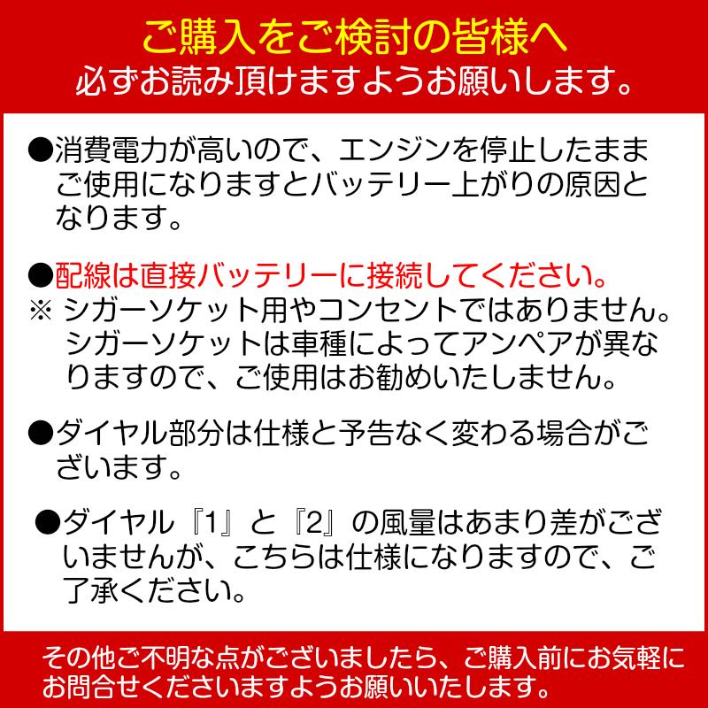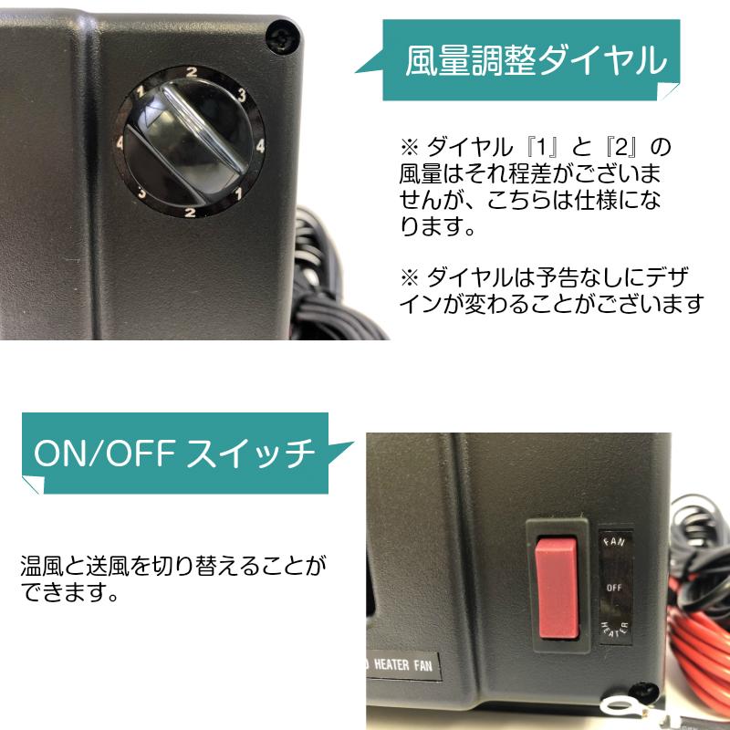 写真のダイヤル部分が予告なく変わる場合がございます直流専用のセラミックヒタですボトやキャンピングカの簡易的な暖房に最適です温風と送風を切り替える事が出来風量もダイヤルで調節できます電源ケブル約ブレドフュズ付属付です本体寸法幅高奥電源直流ご注意消費電力が高いのでエンジンを停止したままご使用になりますとバッテリ上がりの原因となります配線は直接バッテリに接続してくださいシガソケットは車種によってアンペアが違うためご使用はお勧め致しかねますダイヤルとの風量はあまり差がございませんがこちらは仕様になりますのでご了承くださいキャンピングカ 重機 ボト 車 自動車 暖房詳しくはこちらをクリック