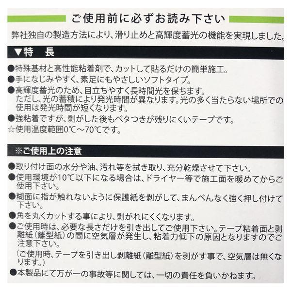 商品名 水上 高輝度蓄光ケアフォロテプ 巻 商品内容 暗闇で光るノンスリップテプで規格級の蓄光力屋内の通路階段など停電時の避難誘導に最適な屋内用滑り止め蓄光ケアフォロテプ特長特殊基材と高性能粘着剤でカットして貼るだけの簡単施工手になじみやすく素足にもやさしいソフトタイプ高輝度蓄光のため目立ちやすく長時間光を保ちますただし光の蓄積により発光時間が異なります光の多く当たらない場所での使用は発光時間が短くなります強粘着ですが剥がした後もベタつきが残りにくいテプです用途手摺階段スロプ床踏み台その他 幅広い用途に使用出来ます 商品スペック 寸法約巻原産国日本使用上の注意事項取り付け面の水分や油汚れ等を拭き取り充分乾燥させて下さい使用環境が以下になる場合はドライヤ等で施工面を暖めてからご使用下さい糊面に指が触れないように保護紙を剥がしてまんべんなく強く押し付けてい角を丸くカットする事により剥がれにくくなりますご使用時は必要な長さだけを引き出してご使用下さいテプ粘着面と剥離紙離型紙の間に空気層が発生し粘着力低下の原因となりますのでご注意下さいご使用時テプを引き出し剥離紙を剥がす事で空気層は無くなります本製品にて万が一の事故等に関しては一切の責任を負いかねます 送料配送についての注意事項 本商品の出荷目安は 営業日 土日祝除くとなりますお取り寄せ商品のため稀にご注文入れ違い等により欠品遅延となる場合がございます沖縄離島および一部地域への配送時に追加送料がかかる場合や配送ができない場合がございます
