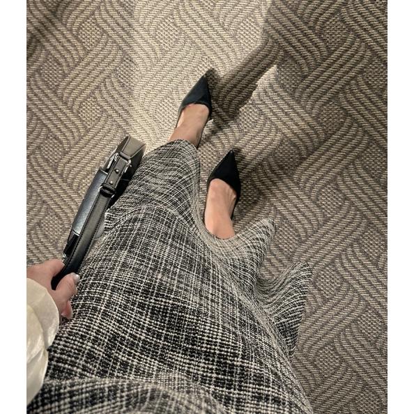 ツイード ワンピース ロングスカート フレアスカート ジャンパースカート ジャンスカ 膝下 ミモレ ミモレ丈 ロング ロング丈 袖なし ラウンドネック 襟なし