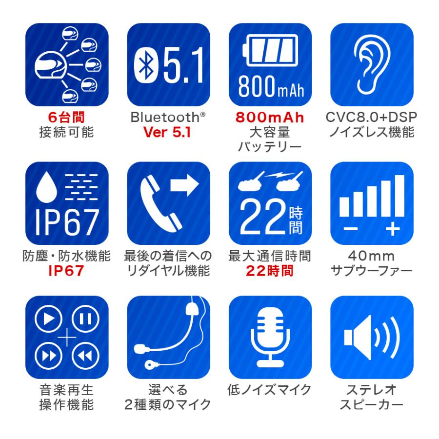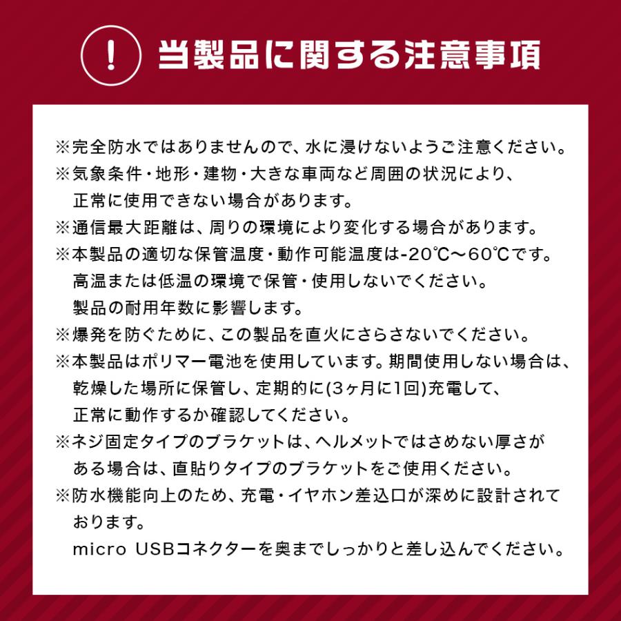安心のヵ月保証台接続可能人の間でのようにハンズフリ通話ができますさらに接続でスマトフォンミュジックプレイヤの音楽をステレオ高音質で聴けますスピカの品質も向上相手の声や音楽もクリアに聞こえます聞き取りにくい音もカットするノイズキャンセラ搭載防水機能でにわか雨でも大丈夫ツリングサイクリング建設現場ウインタスポツに仕様本体サイズ約幅高さ厚みペアリング通話可能数機ペアリンググルプ数機と同じ機種インカムとのペアリングも可能最大通信距離約直線距離環境により変動使用可能時間約待機時時間 使用時時間バッテリ容量充電時間約時間防水生活用防水ノイズキャンセラ搭載対応 他携帯からの着信可能接続での充電商品内容本体 マイクスピカ ケブル 固定用ブラケット 英語版取扱説明書 お得なセット販売 個 個セット 個セット 個 個セット 個セットの場合梱包サイズの関係により個口以上になった際は個口につき円のお手数料が加算されます当店は販売専門店となりますメカではないため専門的なご質問適合や取付使用方法等にはお答えできない場合があります入荷状況により細かな仕様変更がある場合がございますその場合は現品が優先されます予めご了承ください当店の商品はすべて海外からの輸入品となります通常取扱説明書は製造元が用意するものですが商品製造の海外製造元は説明書をご用意しておりません製品の仕様設置や組み立てに関しては商品ペジの詳細や画像にてご確認ください