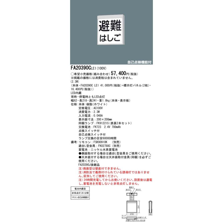 FA20390C LE1 LED防災設備標示灯 天井直付型 両面型 リモコン自己点検機能付 Panasonic パナソニック 防災照明 施設・店舗照明