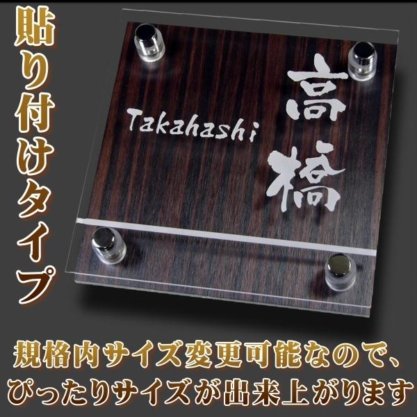 木目 黒檀こくたん自由サイズの木目表札で腐らないアクリル表札表札サイズ以内でご指定可能全体の厚みは化粧ビスを除き約木目模様は黒檀の木の木目を採用裏側が平らなため両面テプで簡単に取り付けが可能です彫刻代版下代制作代も全て商品に入っております木目 木製 木 黒檀 こくたん コクタン 木目柄木目表札 黒檀こくたん コクタン 以内自由サイズ 貼り付けタイプなので取り付けも簡単ですデザイン決定後営業日の最短発送木目の表札で腐らない自由サイズの人気の木目表札お客様からおしゃれで腐らない木目の表札が出来ないかとのご要望でできた黒檀模様の木目表札です機能門柱から玄関ポストやマンションまで幅広く使えてとても人気の表札です和洋を兼ね備えたデザイン表札です自由サイズ 黒檀コクタンの木目表札以内で自由に変更可能なのでご希望のピッタリサイズの表札が出来上がります 以内でしたら自由にサイズを変更することが可能です サイズ指定がある場合にはご注文の際に縦と横の指定をお願いいたします 次のように困ったことはありませんかまたは心配した事はありませんか 雨に濡れて直ぐに駄目になってしまった 年経たない内に割れてしまった カビが生えてしまった 濡れたら文字が滲んでしまった 木の表札はお手入れが大変 コティングが駄目になって汚くなってしまった 等など お客様のお話をお伺いしてなんとか長持ちする木目表札が出来ないかと試行錯誤して完成した表札です また立体感を出して他にはない木目の立体表札となります 他にはない立体感をもつ木目表札でお洒落にお家を演出して下さい 取付金具化粧ビス版下代彫刻代等全てついております デザインも校正まで含めてつまで無料 取り付けも簡単裏側がほぼ平らなため両面テプで貼り付けて下さい 木目シリズ 木目表札のこだわり ベスプレトはあり高級感と重圧感を演出しております また彫刻部のクリアプレトの間を開けることにより文字の立体感を表現 木目に影が映りこむお洒落な表札に仕上がりました 表面には凸凹があり本物の木のような質感を出しております シリズ 木目表札の仕様 下記は全て商品に含まれております サイズ 以内自由サイズ 全体の高さ約取付金具は除くベスブラックプレト 彫刻部 クリア樹脂プレト ベスプレト ホワイト樹脂プレト木目シト木目は黒檀となりますまた長期屋外耐候性の看板用極厚木目シトを仕様 デザイン 校正を含めて回まで無料 校正目よりデザインにつき円税別 取付金具 化粧ビスを使用 軽量の為外壁用の両面テプで取り付けが可能です裏面に穴はありません 特典 版下代彫刻代製作料も全てご購入代金に含みます その他 材料は日本製の材料を全て使用品質にも自信があります 彫刻部は裏側より深彫り彫刻を施します ベスプレトと彫刻部のクリアプレトの間を開けることにより文字の立体感を表現 彫刻部は白くなります 納期 営業日以内の発送 写真見本の仕様 デザイン番号 書体 その他のデザインはこちらからお選び下さいデザイン一覧人気書体漢字ロマ字 人気書体ロマ字のみ その他の書体はこちらよりお選び下さい書体一覧