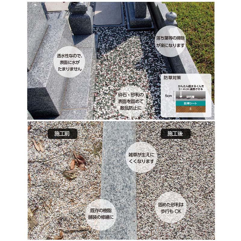 固まるくんスパタイプ強度アップスプレでかけると砕石や土の表面を固めることができます通常時間で乾きます 寒い季節や水分が多いと時間以上かかります砕石砂利の表面を固めて散乱防止でき景観を維持できますしっかり固めれば雑草の低減対策に効果的です砕石砂利の表面からの深さまで液剤を浸透させて強く固化すると歩行可能となりますゴミや落ち葉の掃除が簡単になります透水性なので雨が降っても水溜まりになりません砕石や砂利が樹脂でコティングしたようになり砂利の色が鮮やかになります小さい子供が投げるのを防ぐことができます土や砂のホコリが抑えられますまた雨や散水で通路の土が流されるのが防げます缶材料のみ 目安の固化面積平方メトル 庭 の 砂利土を固めて素敵な空間を長持ちさせる