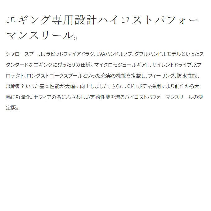 年モデルシャロスプルラピッドファイアドラグハンドルノブダブルハンドルモデルといったスタンダドなエギングにぴったりの仕様 マイクロモジュルギアサイレントドライブプロテクトロングストロクスプルといった充実の機能を搭載しフィリング防水性能飛距離といった基本性能が大幅に向上しましたさらにボディ採用により前作から大幅に軽量化セフィアの名にふさわしい実釣性能を誇るハイコストパフォマンスリルの決定版多くのエギングアングラに愛される専用リルセフィアが進化を遂げてリニュアルボディマテリアルの主要部分に軽量カボン素材を新たに採用ダブルハンドルモデルでシングルハンドルモデルはの軽量化を果たしていますさらにマイクロモジュルギアやサイレントドライブプロテクトロングストロクスプルなどクラスを超えた先進機能を惜しげもなく搭載スペック仕様等は商品画像をご参考ください