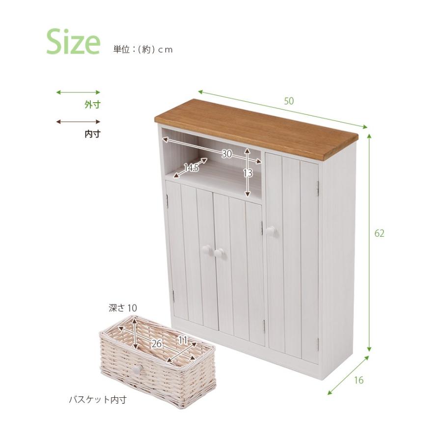 カントリ調で個性的なトイレラック温かみのある編み上げバスケット付きサイズ約幅奥行高さ材質仕様主材桐材柳 バスケット内寸約幅奥行深さ 扉内内寸小約幅奥行高さ上下 扉内内寸大約幅奥行高さ 可動棚扉大枚ピッチ段階完成品北海道沖縄離島は別途送料お見積りとなります