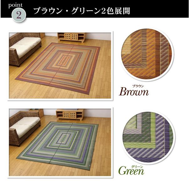 メカより出荷します純国産 袋三重織 い草ラグカペット グラデション ブラウン 約裏不織布縦糸の本数が多い袋織りという技法で繊細な柄を出しています折れ曲がりが複雑なので長いイ草を使用しないと切れてしまいます縦糸が密なのでしっかりとして破れにくいのが特徴です国産九州産のい草を使用しています一本一本が太く表皮が厚く繊維がキメ細かいので弾力性があり耐久性に優れていますい草には空気の自然浄化作用湿度の調節作用などがありますまた汚れにくく使用するうちに黄金色に変化し味が出ます裏には不織布を貼っていますのでフロリングでのご使用にも適していますい草に青森ヒバ加工を施しています抗菌防臭効果