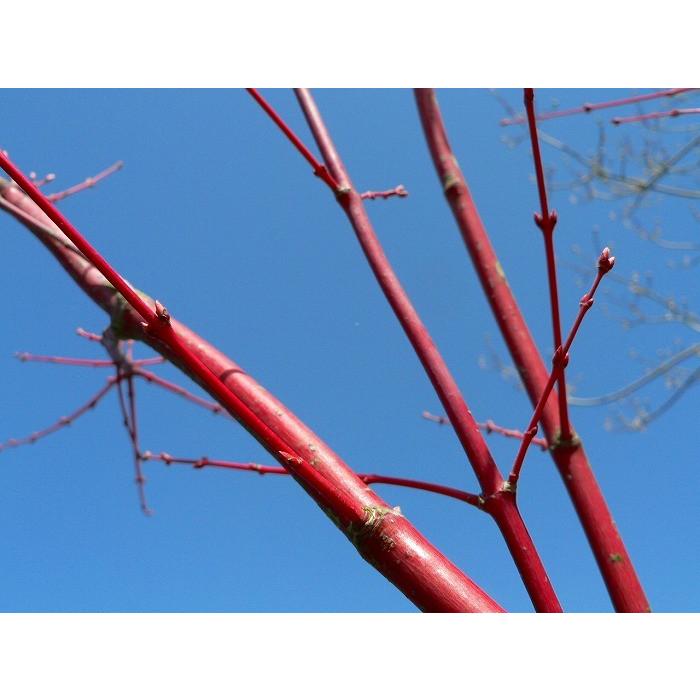 サンゴカクモミジは若い幹が赤くさんご礁のように見えることが名前の由来です落葉しても枝は綺麗な赤色です新芽は黄色に赤い縁取りのような色合い葉の緑と赤い枝の対比が美しく秋には黄色の葉に変わります