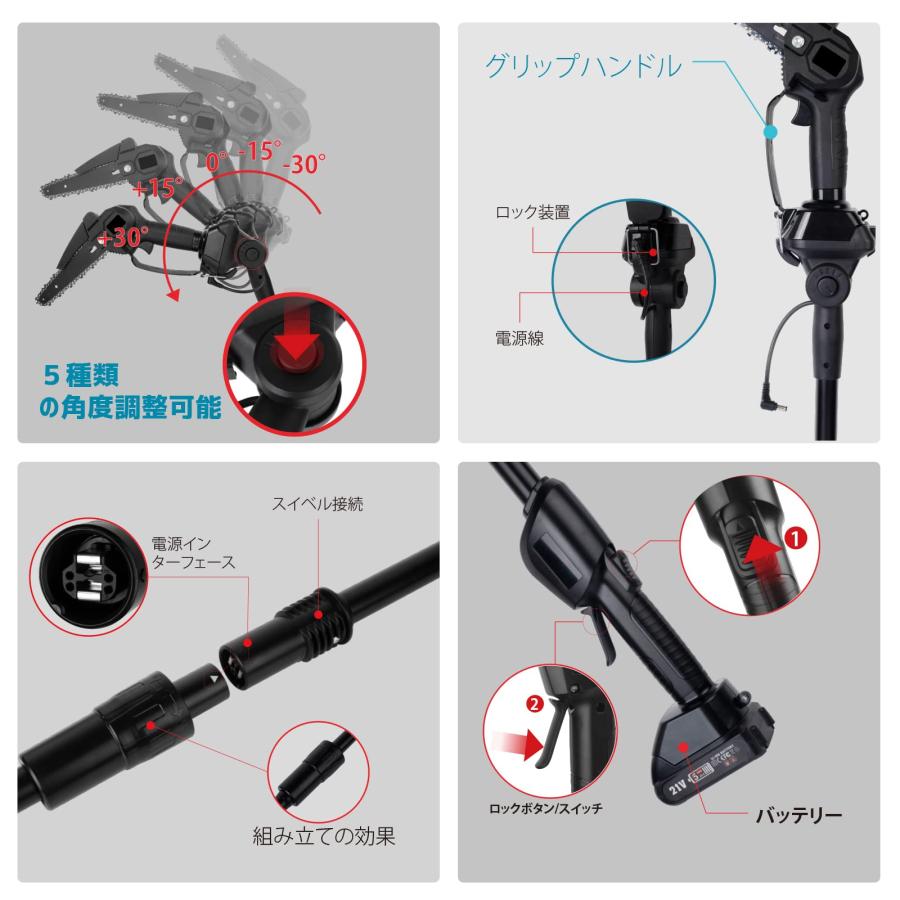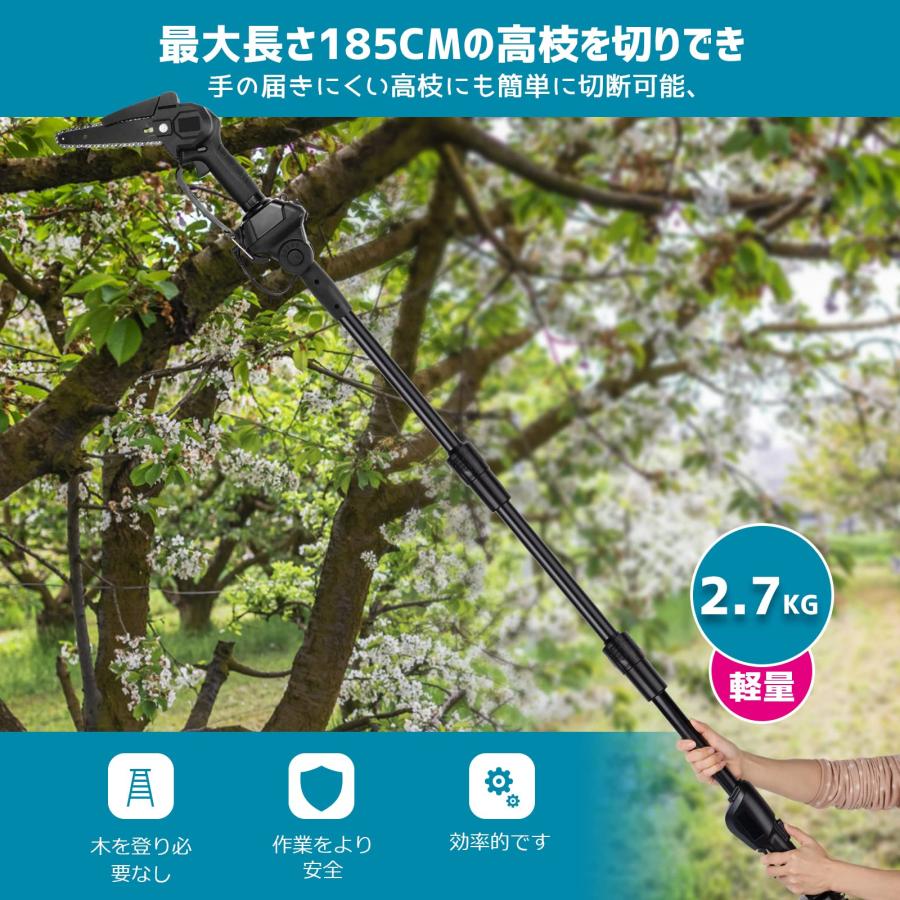 高枝切り電動チェーンソー 充電式 6インチ 2個 21Vリチウムイオン バッテリー付 コードレス 3段階伸縮延長ポール 最大長さ185CM切断 角度調節可能