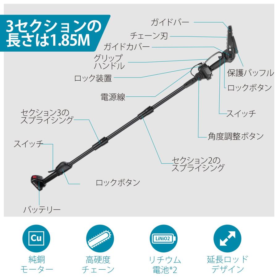 高枝切りチェンソ最大長さ 高所の作業でも脚立にのぼることなく作業できる高枝ポルチェンソ延長ポルを繋げると最大約になり高所の太い枝も容易に剪定可能木登りや脚立を準備する手間も要りませんので作業をより安全かつ効率的にしますご注意安全のため保護メガネをかけて作業を行ってください 高枝切ミニ電動チェンソの組み合わせミニチェンソと高枝切り電動チェンソを自由に切り替えて伸縮式ポルで高い枝木の切断だけではなく手持ちの小型チェンソにも素早く変換できさまざまな作業に対応可能ですヘッド部分は段階 度の角度を調節可能ので作業によって簡単に調整でき手軽に枝を切断できます軽量作業の負担がありませんチェンソ 高枝切はわずかの軽量女性にもお年寄りにも手早く木の枝が切れますまた重量配分がいいので扱いやすくて手腕背中足への負担を軽減し長時間の作業が可能です木材の切断高枝伐採庭の手入れが簡単で楽しくなりますコドレスチェンソで場所を問わずにどこでも使用ができます インチ 充電式 電動 チェンソ ガイドバのサイズインチ チェソスピド無負荷時 伸縮延長の長さ 伸縮ロッド通常の高さ バッテリリチウム電池個 充電時間約時間 連続作業時間約分個 マキタバッテリに適用可能
