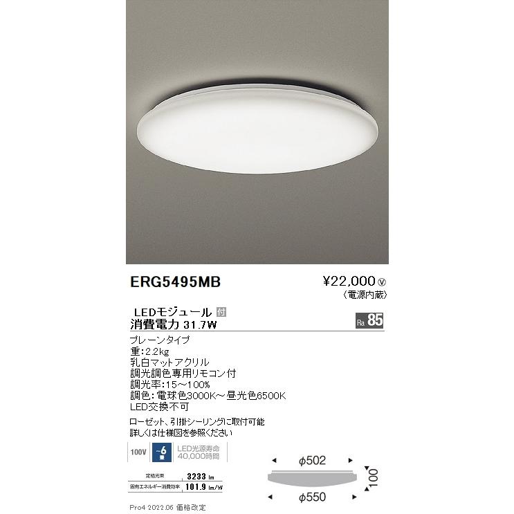 ERG5495MB LEDシーリングライト 調光・調色タイプ 〜6畳用 プレーンタイプ 専用リモコン付 電気工事不要 遠藤照明 施設照明 【〜6畳】