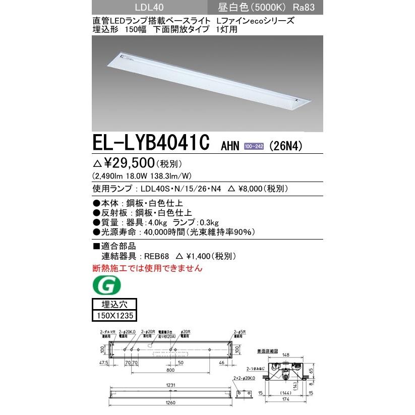 EL-LYB4041C AHN(26N4)直管LEDランプ搭載 ベースライト 埋込形 LDL40 150幅 下面開放1灯用 非調光 2600lmクラスランプ付 昼白色 三菱電機