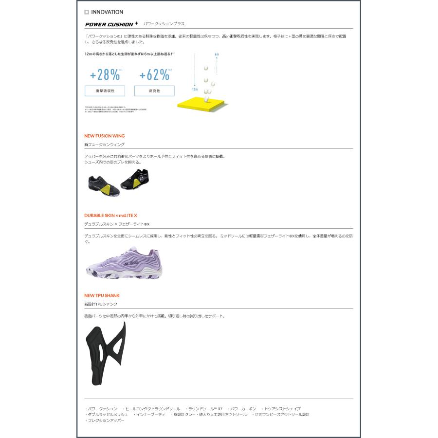 店頭在庫とも兼ねており在庫ありと表示されていても完売の場合もございますその場合メルにてご連絡後当店にてキャンセル手続きをとらせていただきますのでご了承下さい在庫なしと表示されていてもメカ在庫のあるものはお取り寄せにて対応させていただきますのでお問い合わせくださいその場合数日お待ちいただきますことをご了承下さいメカヨネックス品名パワクッションフュジョンレブウィメン 品番生産国ベトナム製特長フィット性を高める新フュジョンウィングが電光石火のフットワクを授けるタイプロカットカラブラックホワイトサンドレッドホワイトアッパ合成繊維合成樹脂ミッドソル合成樹脂アウトソルゴム底サイズ対象コトクレ砂入り人工芝コトメカ希望小売価格はメカサイトに基づいて掲載しています 店頭在庫とも兼ねており在庫ありと表示されていても完売の場合もございます その場合メルにてご連絡後当店にてキャンセル手続きをとらせていただきますのでご了承下さい 在庫なしと表示されていてもメカ在庫のあるものはお取り寄せにて対応させていただきますのでお問い合わせください その場合数日お待ちいただきますことをご了承下さい 本商品は日本ソフトテニス連盟の使用基準に準拠しておりますが中学生の各連盟主催大会ではまだカラシュズの使用許可は認められてない場合もございますので各都道府県連盟にご確認ください インソル中敷きはこちら ヨネックスのテニスシュズはこちら ヨネックスのテニスシュズクレ砂入り人工芝コト用はこちら 全てのテニスシュズはこちら メカ ヨネックス 品名パワクッションフュジョンレブウィメン 品番 生産国ベトナム製 特長フィット性を高める新フュジョンウィングが電光石火のフットワクを授ける タイプロカット カラロズピンクレッドホワイトミントグリン アッパ合成繊維合成樹脂 ミッドソル合成樹脂 アウトソルゴム底 サイズ 対象コトクレ砂入り人工芝コト パワクッション プラス 衝撃吸収性と反発性を併せ持つ衝撃吸収反発素材パワクッションがさらに進化 素材や形状の研究を重ね従来の軽量性を維持しながら衝撃吸収性アップ反発性アップ一般的な衝撃吸収材との比較を実現しの高さから落とした生卵が割れずに以上跳ね返る弊社調べ新衝撃吸収反発素材 パワクッション 衝撃吸収性と反発性を併せ持つ軽く疲れにくい衝撃吸収反発素材ヨネックス独自の衝撃吸収材です フュジョンウィング アッパ中足部内部に搭載された羽形状パツがかかと部から中足をしっかりとホルド 足のシュズ内でのブレを最小限に抑える ダブルラッセルメッシュ 通気性クッション性に優れ柔らかく足を包み込むメッシュ素材 デュラブルスキン 耐摩耗保形力に優れ主に前足部に採用し横ブレ変形が少なく耐摩耗性も併せ持つ フェザライトエックス 一般的な材よりも約軽量素材ハイパフェザライトからも約の軽量化を実現 弊社調べ フレクションアッパ 足の甲部を湾曲させ内外を非対称にした新アッパ設計 圧力の部分的集中を少なくしアッパ全体で包み込むようなフィット性を生む インナブティ構造 タングと履き口を一体化重なりを無くすことで足とシュズとの隙間をなくしフィット性を高める トウアシストシェイプ 親指の圧迫感を解消したつま先設計としかつ中足部とかかと部のサポト性を高めることでシュズ内の足のズレを抑えパワロスのない素早いフットワクを実現 ラウンドソル アウトソル外周全体に種類の丸みを持たせ自然な着地と蹴り出しが可能 数字が大きいほどソル外側の丸みが大きく安定性重視 特許第号