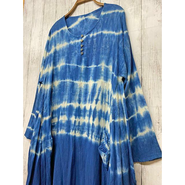 天然藍染めで仕上げたハンドメイド作品になります天然素材のコットンの優しい風合いと柔らかくサラッとした着心地が良く肌になじんでゆき春夏秋冬問わずに楽しんでいただける長袖バルンワンピスです裾にかけてのバルンシルエットがゆったりフワッと優しい雰囲気を演出してくれます体型カバにもなるシルエットで着心地も楽ちん裏地はなく透け感があるのでインナを入れた方がより楽しめます肩幅約袖ぐり約袖丈約袖口約身幅約裾幅約丈約裏地無しモデル身長 天然藍染めのハンドメイド作品になります多少のムラ感がありますが手染めならではの深い味わいのある作品とご理解していただけたら嬉しいですモデルが着用しているアクセサリや他衣料等は着用例です付属はいたしませんのでご了承ください着こなしの参考にしていただけたら嬉しいですタイダイは一枚一枚表情が違うのが特徴ですが当店では写真の物をお送りいたしますので安心ですよサイズは多少前後することがございますご了承ください 天然藍染めで仕上げたハンドメイド作品になります天然素材のコットンの優しい風合いと柔らかくサラッとした着心地が良く肌になじんでゆき春夏秋冬問わずに楽しんでいただける長袖バルンワンピスです裾にかけてのバルンシルエットがゆったりフワッと優しい雰囲気を演出してくれます体型カバにもなるシルエットで着心地も楽ちん裏地はなく透け感があるのでインナを入れた方がより楽しめます肩幅約袖ぐり約袖丈約袖口約身幅約裾幅約丈約裏地無しモデル身長 天然藍染めのハンドメイド作品になります多少のムラ感がありますが手染めならではの深い味わいのある作品とご理解していただけたら嬉しいですモデルが着用しているアクセサリや他衣料等は着用例です付属はいたしませんのでご了承ください着こなしの参考にしていただけたら嬉しいですサイズは多少前後することがございますご了承くださいご使用の環境によっては画像と色が若干異なることがございます
