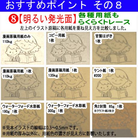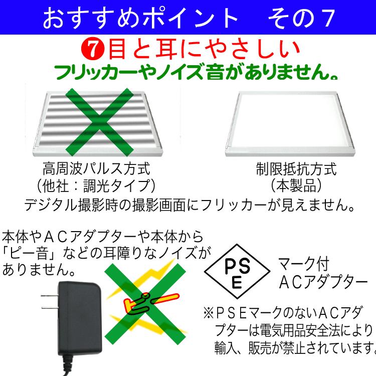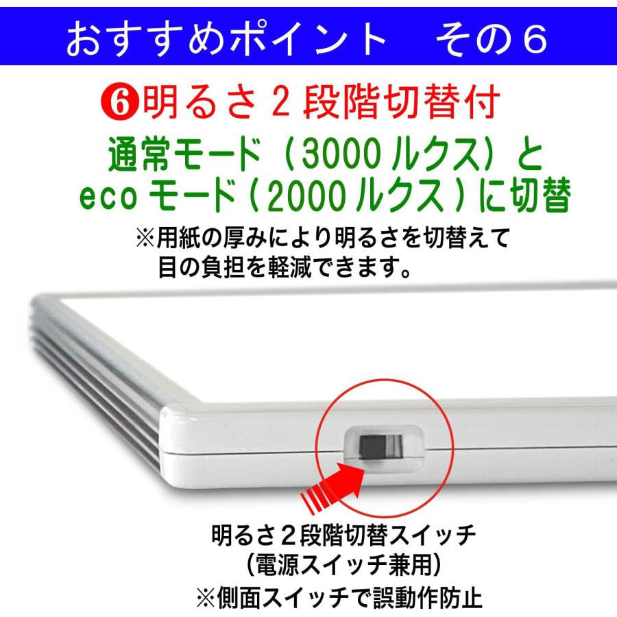 厚の透明ポリカボネト製保護カバ付おすすめポイントその誤動作を防止する本体側面のスイッチ 上面スイッチに触れて点いたり消えたりしませんその明るさ段階切替スイッチ内蔵 通常モドルクス エコモドルクスその発熱を少なくする低発熱設計の 放熱アルミフレム内蔵その樹脂製ケスとアルミフレム使用 他社薄型トレス台のようにペコペコ たわみません そのデジタル撮影時に見えるフリッカや アダプタからのノイズ音がありませんその樹脂製ケスとアルミフレム使用 側面の光漏れがありませんその色再現が高い日亜化学製高演色搭載 平均演色評価数色温度その国産高演色で明るく鮮やかな発光 各種用紙もらくらくトレスその発光面はサイズ 収納便利なコンパクトサイズ傾斜用ゴム足は付属しません コミケ同人誌などマンガ原稿のトレス作業ネガポジィルムのチェック製造工程の検査用光源にご使用頂けます 厚の透明ポリカボネト製保護カバ付属 再接着可能な両面テプを使用 仕 様 発光面寸法サイズ明るさ通常モドルクス モドルクス 明るさ切替スイッチ付平均演色評価数日亜化学製高演色色温度約青い色を抑えた白く見える光放熱用アルミフレム内臓寿命約万時間外形寸法 重量 低消費電力通常モドモド アダプタ付属規格家庭用電源で使用できますマク付アダプタなので安心ですマクとは電気用品安全法に基づき国の定める安全基準の検査に合格した電気製品に表示されますマクのないアダプタは電気用品安全法により輸入販売が禁止されています年保証 国内専用 規制有害物質欧州規格対応輸出規制該非判定書対応本体型番 傾斜用ゴム足は付属しません