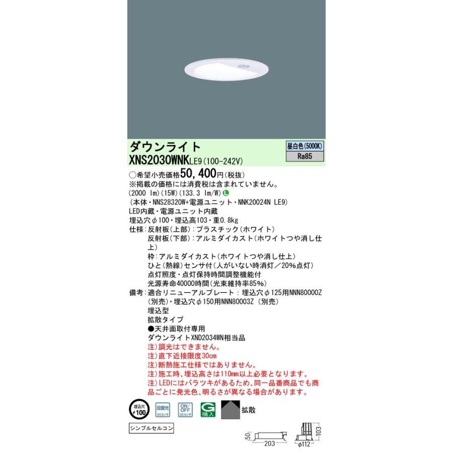 パナソニック XNS2030WNKLE9 ダウンライト 埋込穴φ100 LED(昼白色) 天井埋込型 拡散 シンプルセルコンひとセンサ付 ホワイト
