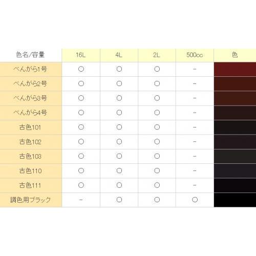 顔料型水性着色塗料べンガラ塗料 乾きが早く塗りやすいカビにも強く色落ちしにくいので木材保護に撥水力抜群で耐候性に優れ施工時の美しさを長時間保つことができます伝統的な日本住宅文化財木部への塗装等ベニガラ仕上げへの塗装が可能です水性タイプで嫌な臭いもなく速乾で環境適正に優れた人に優しい機能性塗料です一度塗りで古色な味わいに仕上がります ベンガラを使用した古色な味わいに仕上がります色数は色と調色用ブラック全色仕様塗布量目安約回塗り原液のままハケ等で塗装してください乾燥時間時間以上内容量調色用ブラック生産国日本