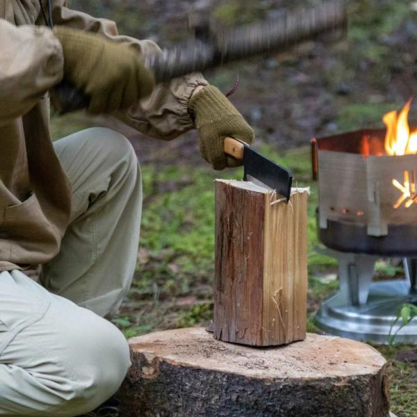 焚き火周りの小割小枝払い用腰鉈軽い力でサクサク枝払い刃先側に重心をおくことで軽い力で振り下ろせる設計木柄と刃の接合部を凹凸なく仕上げたハンドルは手にしっくり馴染みフィット感抜群です刃の形状は両刃仕様となっており焚き付け用の薪割作業や細工バトニングに重宝しますコンパクトなデザイン携帯性を重視したコンパクトデザインにより女性や子供でも使いやすいサイズ感ですストレスを感じることなくフィルドでずっと腰につけていられます仕様材料 刃部材黒染め仕上げ ハンドル部天然木 鞘革サイズ全長 鞘入全長 刃部刃渡り刃幅刃厚最大 柄部長さ厚み幅最大 鞘長さ幅厚みベルト通し含む重量約刃形状両刃生産国日本製天然木を使用した製品のため木目や色の出方には個体差があります ファイヤサイド ファイアサイド ファイヤサイド ファイアサイド アウトドア ナイフ なた ナタ 火育 斧 手斧 薪割り 薪づくり メイドイン伊那谷刃木柄鞘すべてを長野県南部の伊那谷で製造し地域の伝統産業活性化に取り組んでいます木柄も伊那の山林で育った樹種を使用しており伊那谷の想いが籠った一品です木柄の天然木はサクラバラ科の広葉樹であるサクラの木質はやや硬く木目は細かくすっきりとした印象磨くと光沢が出て毛羽立ちが少ないのでお皿やカトラリにも有用されています