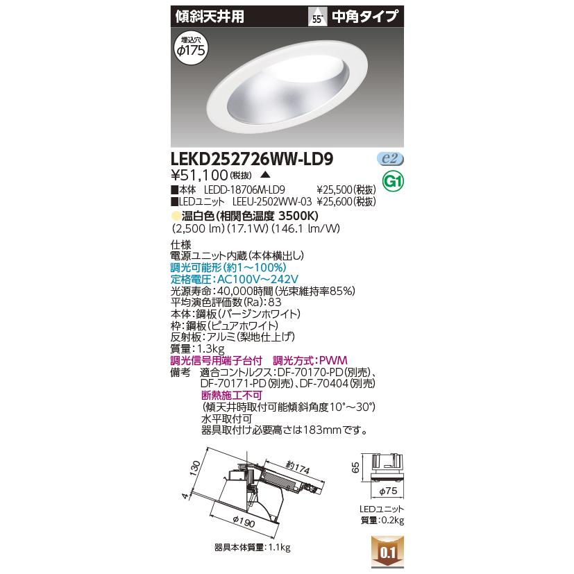 LEKD252726WW-LD9 LEDユニット交換形ダウンライト 埋込穴φ175 傾斜天井用 高効率 2500シリーズ 水銀ランプ100形相当 温白色 中角 調光 東芝ライテック