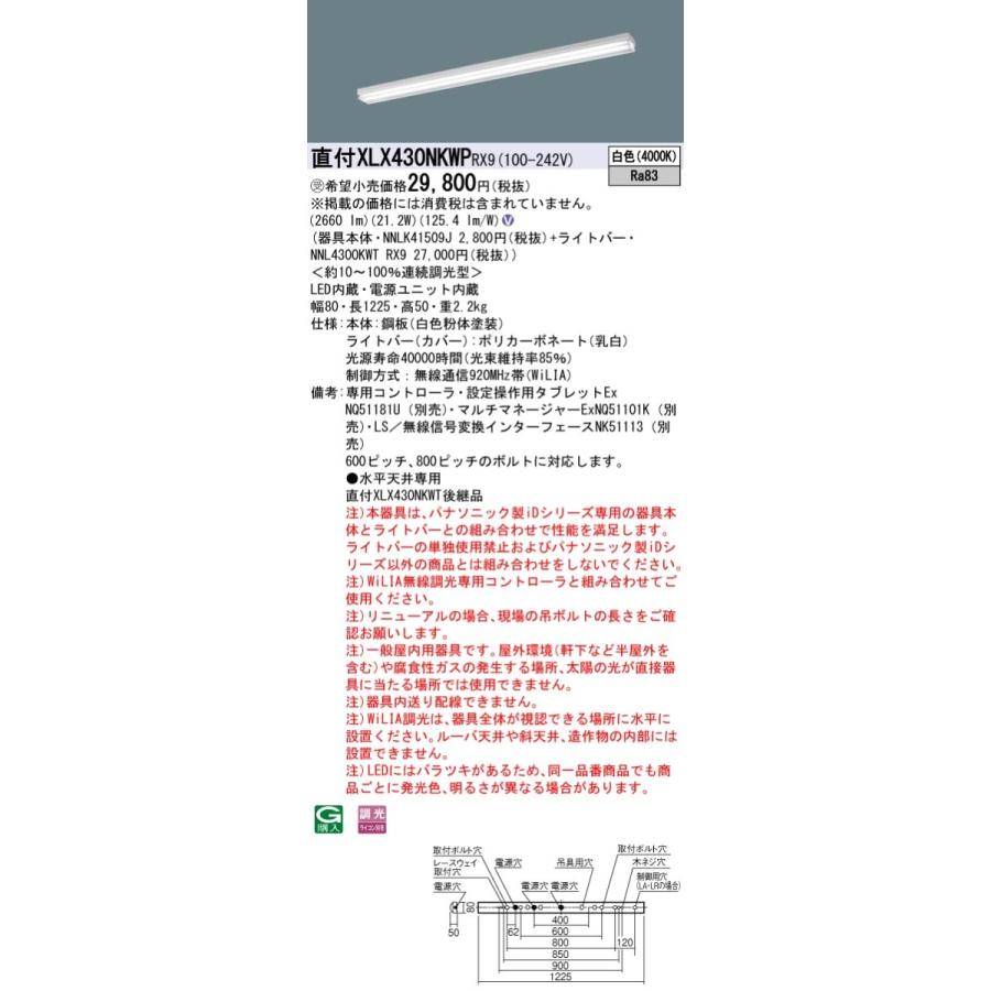 【法人様限定】パナソニック XLX430NKWP RX9 LEDベースライト 40形 笠なし型 3200 lm WiLIA調光 白色【NNLK41509J + NNL4300KWT RX9】【受注品】