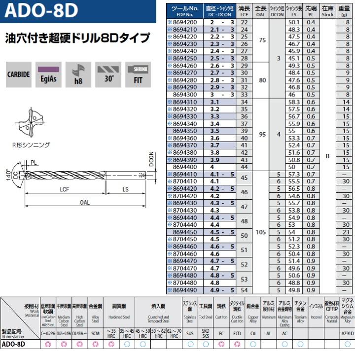 【送料無料】OSG ADO-8D 3.6x4 油穴付き超硬ドリル8Dタイプ