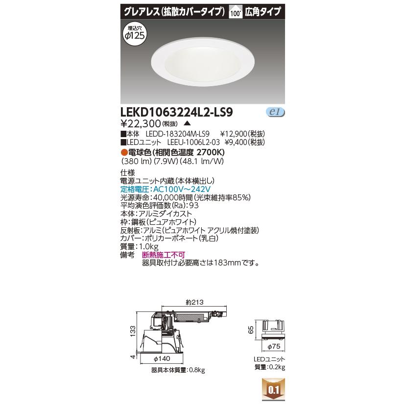 LEKD1063224L2-LS9 LEDユニット形ダウンライト 埋込穴φ125 グレアレス拡散カバー 高演色 1000シリーズ FHT24形相当 電球色2700K 広角 非調光 東芝ライテック