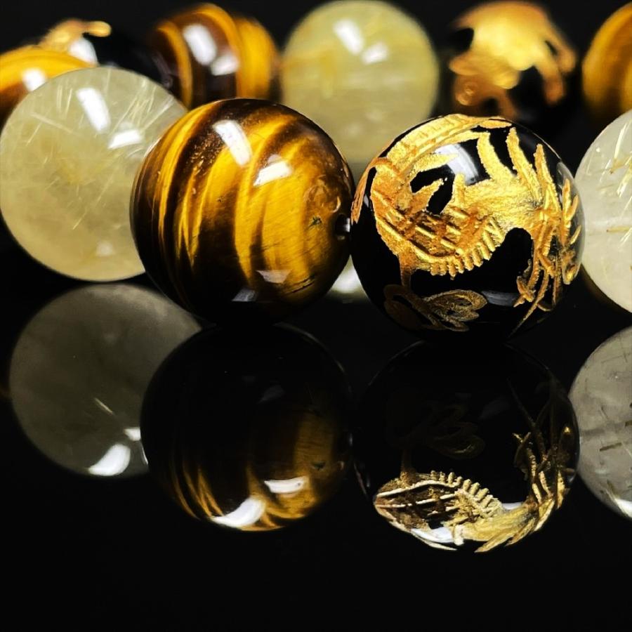 洞察力を高め成功を掴む16ミリ 金彫四神獣オニキス タイガーアイ ゴールドルチルブレスレット 金運 sisin29