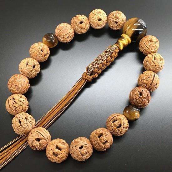 【桃:羅漢彫り 18玉 虎目石仕立 紐房】浄土真宗用・男性用片手数珠