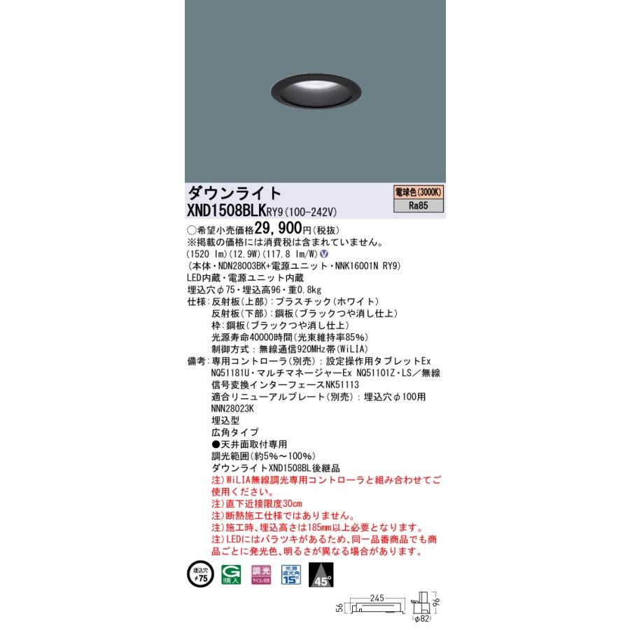 【法人様限定】パナソニック XND1508BLK RY9 LEDダウンライト ビーム角45度 広角 調光 埋込穴φ75 電球色【NDN28003BK + NNK16001N RY9】