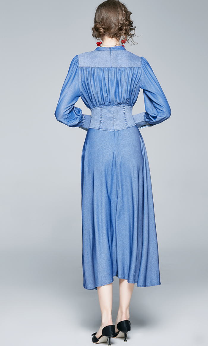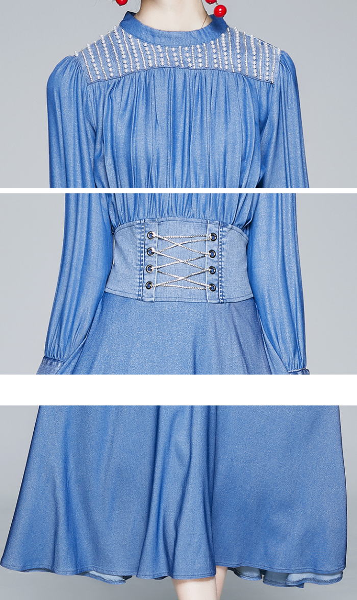 ワンピース スタンドカラー パール ラインストーン 編上げ 長袖 Aライン ロング ワンピース ブルー 水色 レディース 大人 きれいめ 大きいサイズ